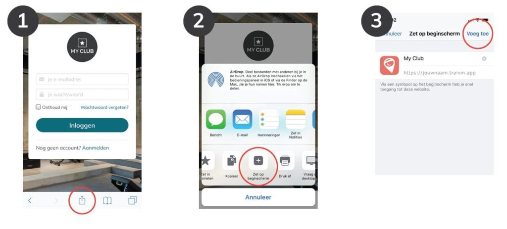 Op iOS (iPhone) via Safari kun je de app opslaan in 3 klikken.